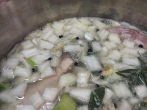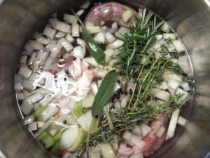 Fill the pot with COLD water, just enough to cover everything. When I say “cover everything”, onions and herbs float, so be aware of that. Don’t float too much.