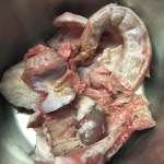 Put the meaty bones, neck, gizzard and heart into a large pot – whatever you have that holds everything with a few inches of head-room. I use the bottom of my spaghetti cooker. Choose something tall and deep so that the surface area is minimal, to reduce evaporation and the need to continually top up the stock with water while it cooks.