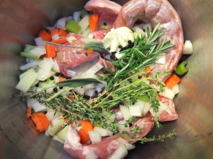 I was taught stock-making at my grandmother’s knee, and then learned how to do it properly under the guidance of my friend and mentor, Chef Simon Dunn, at cooking school. It’s a good skill to have, although hardly essential when pre-fab stock is readily available. In my “use the whole bird” scheme of things, turkey stock is central to the braised dark turkey recipe, so here’s the skinny.