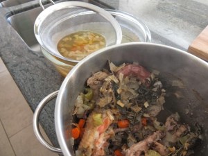 Slowly pour the liquid off the solids, through a nice fine sieve if you have one. If you’re careful, most of the cooked-out stuff will stay in the pot. Don’t even think about tring to harvest the meat from the bones, because it has no flavor left. Ditto the vegetables. Just let them go. Their job here is finished. You’re making stock, remember, not soup.