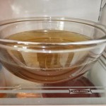 To avoid turning your fridge into a steam-bath, leave the strained stock, uncovered, in a wide bowl, at room temperature for about half an hour before moving it to the fridge. The best procedure, if you have room, is to put the stock container in your sink, then fill the sink with cold water (even adding ice) to hasten cooling. You may want to change the water a couple of times as the stock gives off its heat. When it reaches room temperature or thereabouts, put in in the fridge. Don’t cover it until it is completely cold.