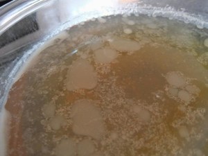 If you’re planning to save your beautiful stock for some future occasion, and you don’t have a huge freezer, you can boil the stock in an open pot until its volume is reduced by half or two-thirds. Use a nice deep pan with a big, open surface for the quickest results (but it won’t be very quick, regardless). Don’t go off to the store or anything while you’re reducing your stock. It takes time, but not forever. Over-reduced stock will taste bitter, but can be rescued with water. Burned stock, however, ruins the pan.